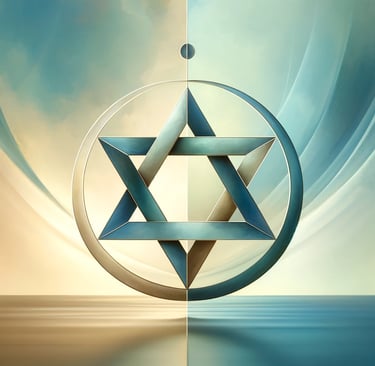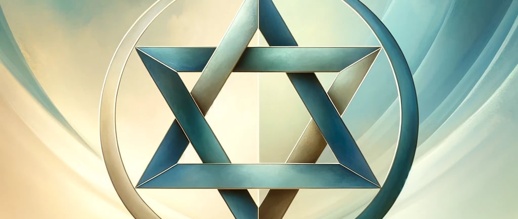 Der Davidstern, oder das Hexagramm, ist ein starkes Symbol für die Verschmelzung von Gegensätzen und die Schaffung von Stabilität durch gegenseitige Ergänzung. Die zwei Dreiecke – eines weist nach oben, das andere nach unten – symbolisieren die Dualität des menschlichen Daseins: das Geistige und das Materielle, das Himmlische und das Irdische. Diese Interpretation unterstreicht die Rolle der Zahl 6 als Vermittlerin, die bestrebt ist, ein Gleichgewicht zwischen diesen Polaritäten herzustellen.